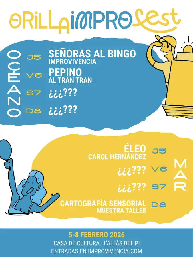 En esta página podrás consultar toda la programación de funciones del Orilla Impro Fest. Cada semana iremos desvelando nuevos shows y talleres, así que… ¡no te pierdas ningún lanzamiento! Recuerda, cuanto más desvelemos de la programación, más subirán los precios, así que viento en popa a toda vela si no te quieres quedar cola de regata.